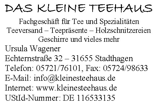 Seit nun bald 40 Jahren sind wir das führende Tee-Fachgeschäft in Stadthagen, im ganzen Landkreis Schaumburg und sogar darüber hinaus. In unseren Geschäftsräumen haben wir eine Atmosphäre geschaffen, die es unseren Kunden ermöglicht, sich bei einer Tasse Tee zu informieren, auszuwählen und einzukaufen. Im gehobenen Ambiente präsentieren wir Ihnen über 250 Sorten Tee, Service, Teegeschirr, Glas, Accessoires, Interieurs - klassisch und modern - und ideenreiche Geschenke rund um den Tee.